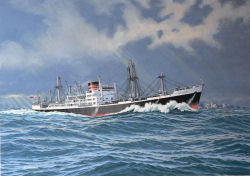 MV Rothley torpedoed by U-boat, WW2. Oil on board, 14.5 x 11 ins / 370 x 275 mm. Book cover for "Another World ~ Home from the Sea. The Bob Smart Story". Commissioned by Malcolm Smart. |
