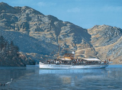 To sail on board the Sir Walter Scott with the dramatic visual backdrop slowly unfolding, coupled with the gentle rhythms of the almost-silent steam engine and soft lapping water, makes for an enchanting experience few ever forget. All the elements of this lovely scene are captured in this atmospheric painting by Gordon Bauwens.
